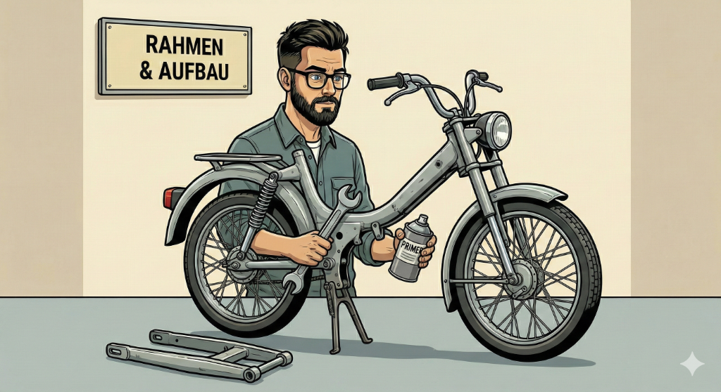 Das ist die Moped-Garage. Wir bauen das, wovon wir mit 15 geträumt haben, aber kein Geld dafür hatten. Heute haben wir das Werkzeug, das Wissen und – sind wir ehrlich – immer noch den gleichen Blödsinn im Kopf.