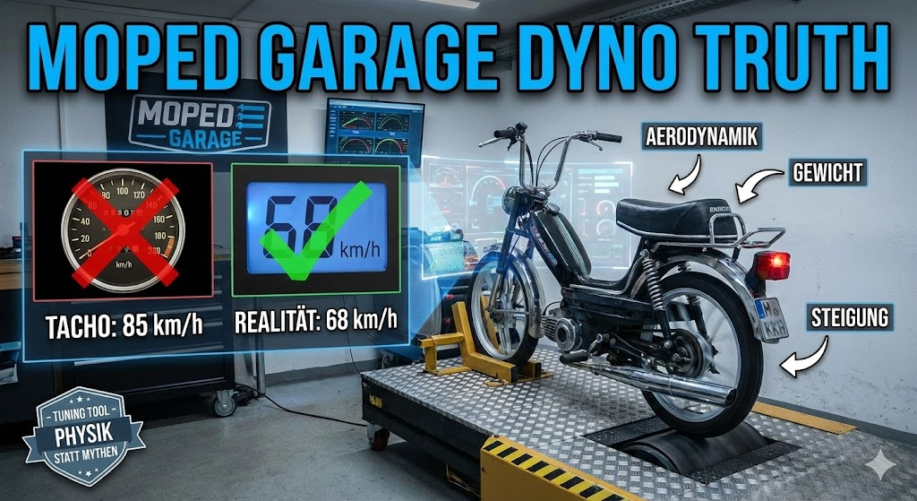 Wir wissen alle: Alte mechanische Tachos sind Schätzeisen, die gerne mal 10-15 km/h zu viel anzeigen, wenn die Nadel anfängt zu zittern. Und wir wissen auch: Physik lässt sich nicht bescheißen. Wer mit einem 50ccm „Gussklumpen“ und der Aerodynamik einer fahrenden Schrankwand echte 80 km/h erreichen will, braucht dafür nicht nur Glück, sondern vor allem eines: Leistung am Rad.